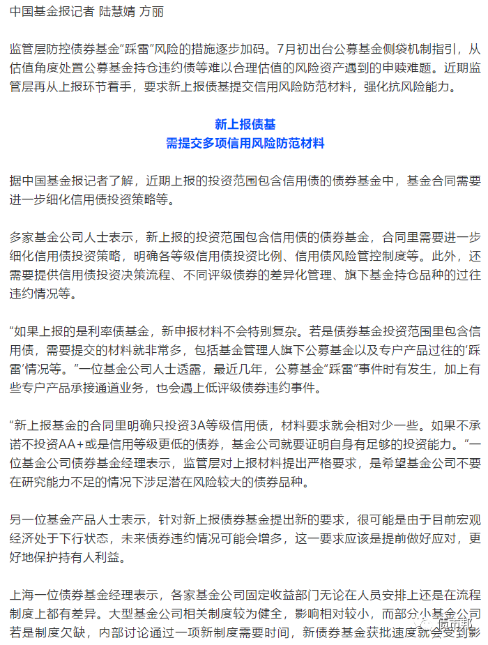 大概意思是,JG觉得部分公募基金的风险把控能力不强,过去乱买债踩了太多雷了。以后基金公司再想新发债券基金,都需要向JG报告公司的整体债券风控体系,JG再评估基金公司有没有实力去投资中低评级债券。