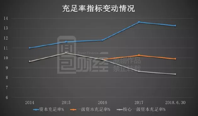 该行的一级资本充足率表现较为平稳,一直10%上下小幅波动,但核心一级资本充足率最近几年却呈现出下滑趋势。以下为根据公开数据整理的重庆银行2014年至今各项充足率指标变动情况:
