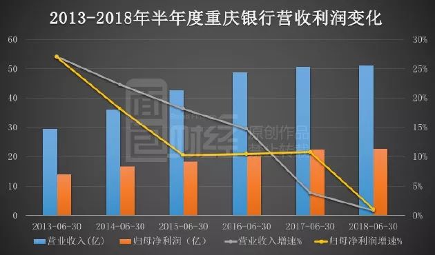 营收净利润实现翻倍增长的同时,增长速度却在大幅下降。上市首年重庆银行营收和净利润的增长速度速均为27%,次年增速便开始下滑。截止2018年6月30日,重庆银行的营收增速仅有0.85%,归母净利润的增速为1.02%,营收净利在2018年上半年趋近于零增长。