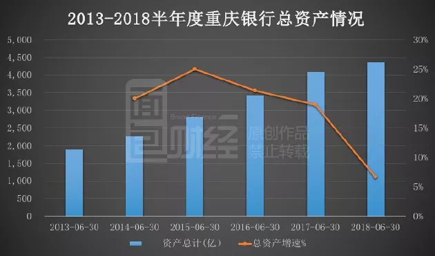 由上图数据来看,在重庆银行上市的头两年里,总资产的增长速度保持在较高水平,但从2016年开始总资产的增速开始下降。截止2018年6月30,重庆银行总资产增速仅有6.71%,较2017年同期总资产18.97%的增速相比降幅明显。