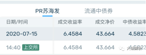 城投的也有,但除了贵州的,收益都不算高。例如PR苏海发(124232),发行人江苏海州湾发展集团有限公司(由于已经偿还了部分本金,成交净价不以100为基准);连云港区级城投,主体评级AA,债券评级AA+。以最近的成交价买入,年化收益能到6.45%;剩余期限是2.68年。