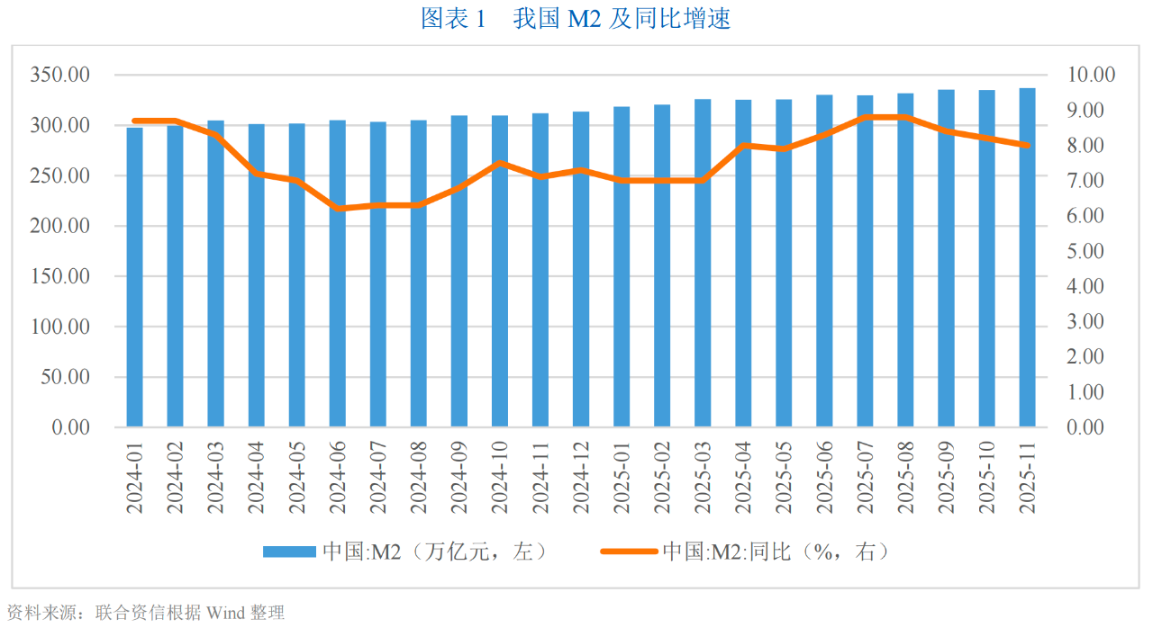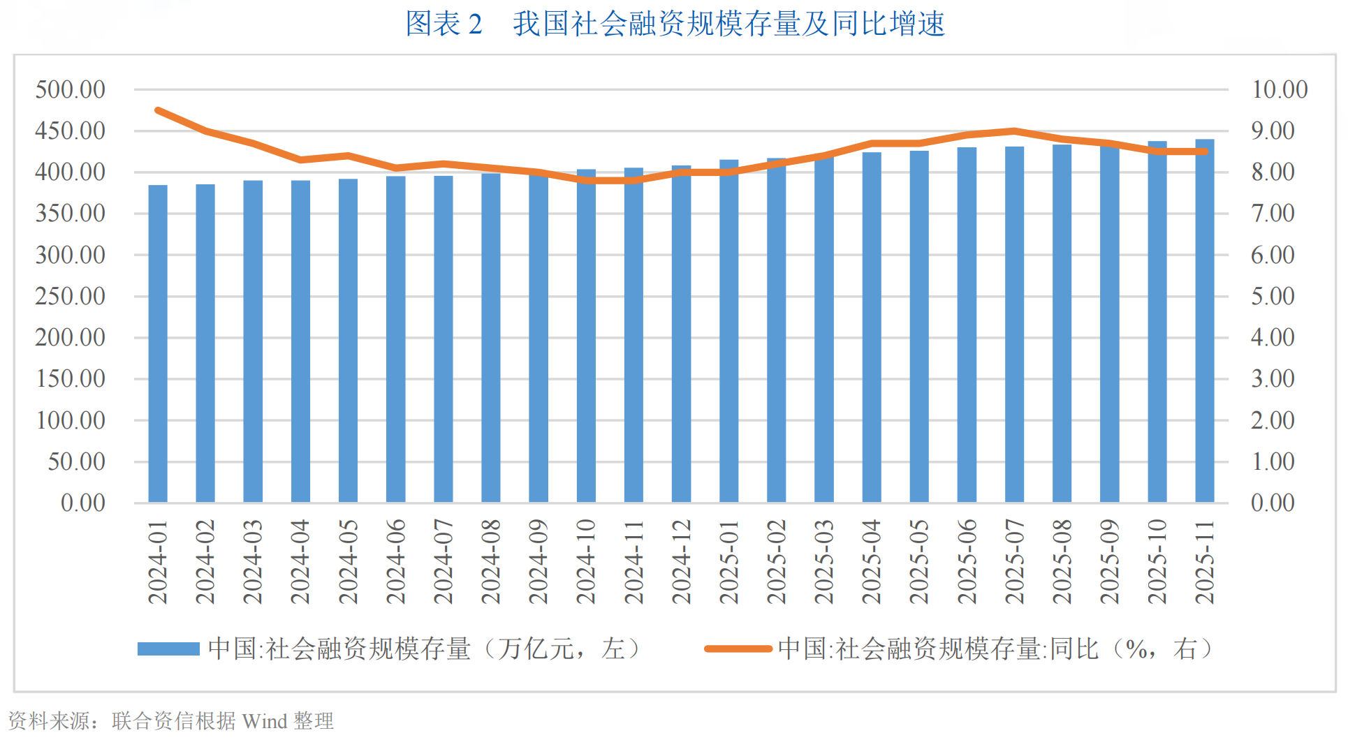 2025年前三季度,我国M2增速呈波动增长态势,其在7月达到年内高点8.80%后,持续回落至2025年11月末的8.00%。全国社融同比增速维持相同的波动态势,增速自7月后持续回落,11月末增速为8.50%。社会融资成本方面,2025年5月,5年期LPR下调10bp至3.50%;央行数据显示,9月,企业新发放贷款加权平均利率约3.1%,较上年同期低40bp,个人住房新发放贷款利率3.1%,较上年同期低20bp,融资成本处于低位。