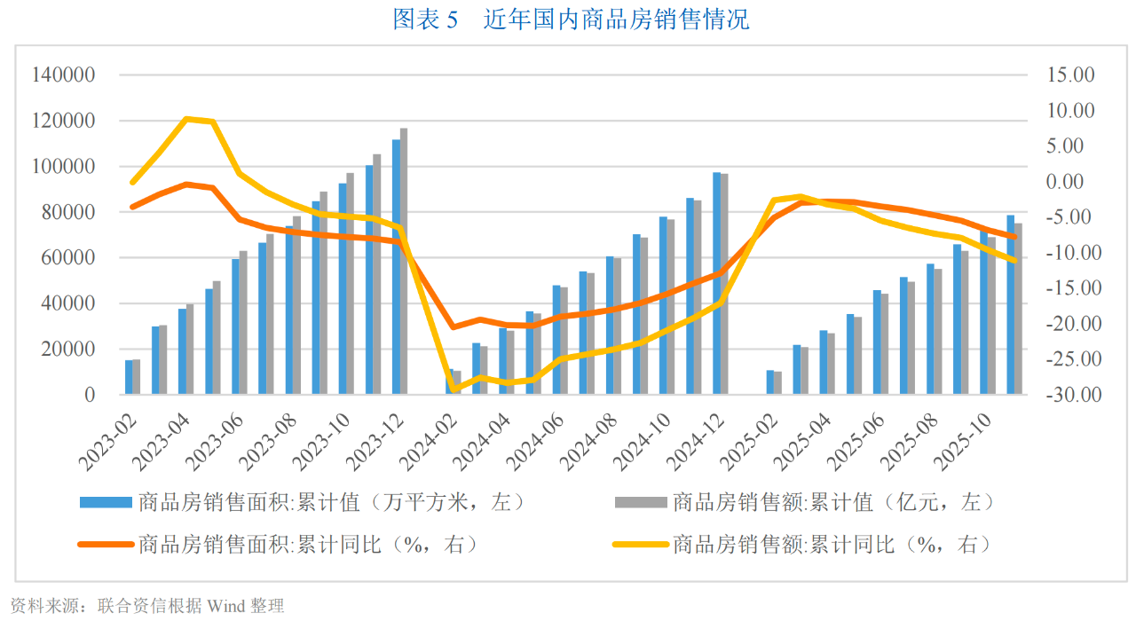 2025年1-11月,全国房屋新开工面积5.35亿平方米,同比下降20.50%,降幅自2025年8月以来持续扩大;房屋施工面积65.61亿平方米,同比下降9.60%,降幅在下半年有所扩大;房屋竣工面积3.95亿平方米,同比下降18.00%,较上年同期收窄8.20个百分点;全国房地产开发投资7.86万亿元,同比下降15.90%,年内降幅持续扩大。