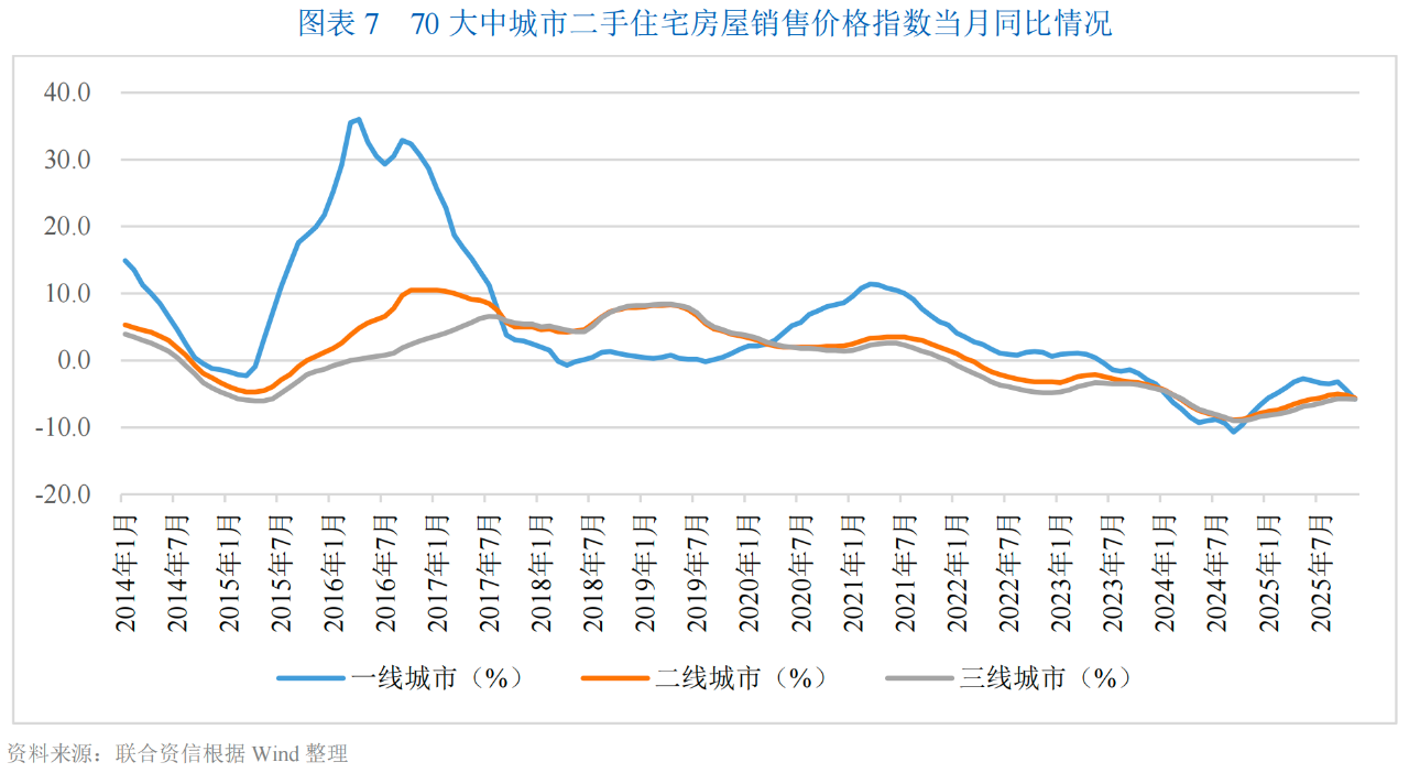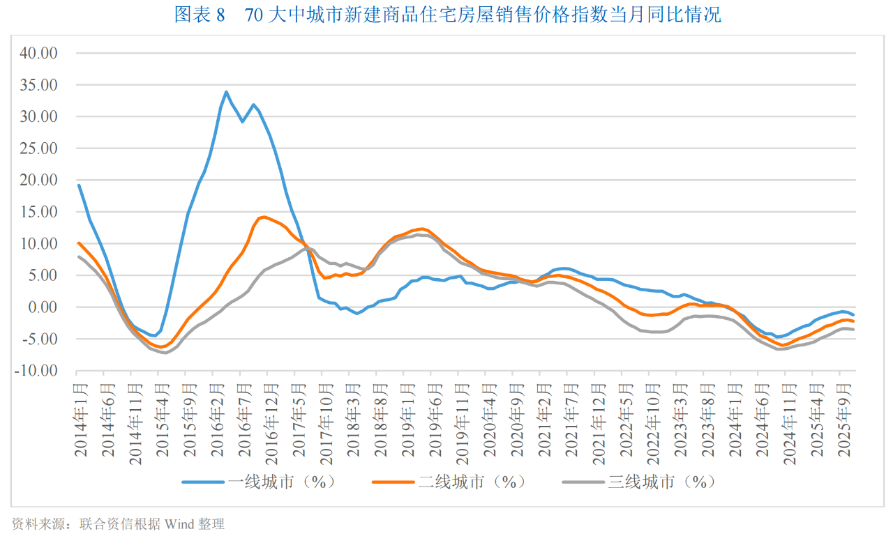 2025年以来,房地产开发经营行业销售端持续低迷,拖累全国固定资产投资增速转负,库存去化周期仍处于高位。房价继续下降,其中一线城市房价在下半年迎来加速下降。虽外部融资环境维持宽松,但房企融资改善效果有限,在此背景下,房企投资积极性不足,开发投资额继续收缩。