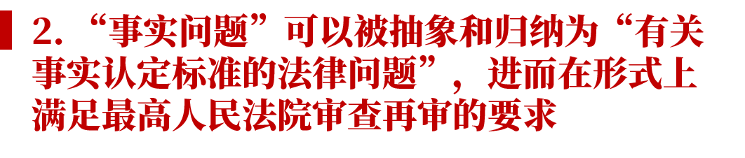 在法律事实的抽象过程中,“事实问题”可能逐渐演化为“有关事实认定标准的法律问题”,进而更可能符合最高人民法院的再审审查标准。本文试举几例: