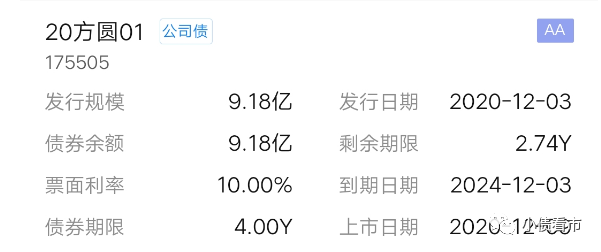 值得注意的是,方圆地产上述两只债券的票面利率分别为10%和13.6%,远高于发行时行业的平均票息7.34%,可见其融资成本较高。
